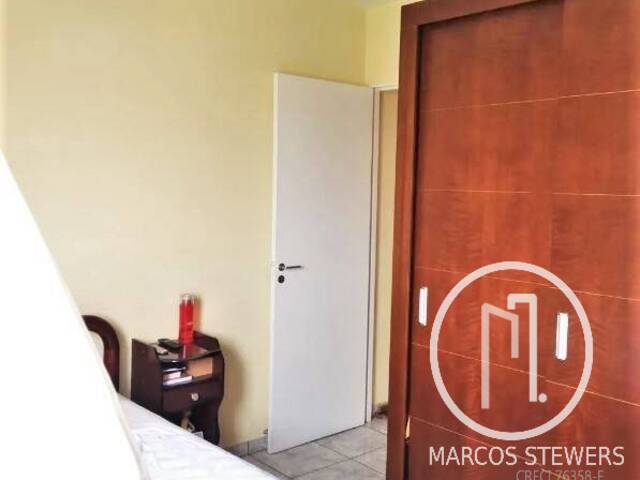 Sobrado de condomínio fechado com dois dormitórios, um lavabo, cozinha planejada, uma vaga de garagem e quintal nos fundos.