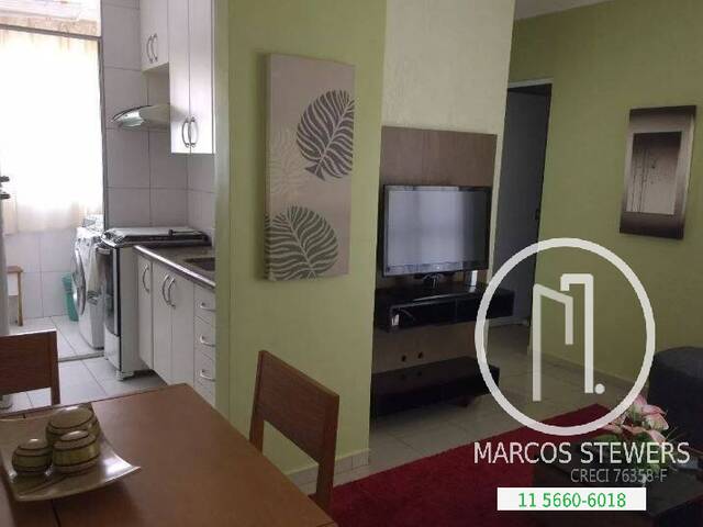 São 49 m², 2 dormitórios, sala de estar/jantar, cozinha com armários, área de serviço, 1 vaga de garagem.
